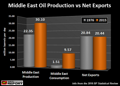 Энергодефицитным странам на заметку - несмотря на то, что страны Ближнего Востока поставили очередной рекорд нефтедобычи, экспорт нефти с Ближнего Востока сейчас меньше, чем 40 лет назад (в 1976), так как рост потребления внутри них идет гораздо быстрее добычи.