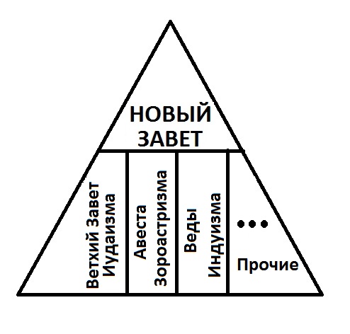 Учитывая все вышесказанное логичным бы было представление Ветхого Завета как основания пирамиды - символического представления развития человека в его отношениях с Богом. В основании пирамиды мы имеем отношения раба, человека, возжелавшего ценить творения Бога больше чем самого Бога и его Закон, отношения раба этих земных ништяков и его авторитетного наказывающего Бога, с чувством вины, со страхом наказания. Это то из чего мы все вышли и на чем стоим с точки зрения этического развития. Вершиной пирамиды, символизирующей последние (в историческом смысле) достижения развития нашего отношения – революционные изменения, новый принцип Любви, когда Христос искупил грех и дал надежду и возможность строить свои отношения с Богом на дороге персонального развития совершенно иначе – полагаясь на Любовь. В новом принципе мораль получается уже встроена и вопрос морального соответствия решен принципом Любви.