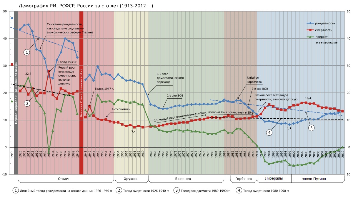 Это же ложь. С 86 по 93 год идёт резкое падение прироста вплоть до перехода в убыль. А с 2005 по 2012 идёт обратный процесс. Идёт снижение убили вплоть до перехода в прирост. Какое ухудшение показателей, когда они противоположны по вектору?