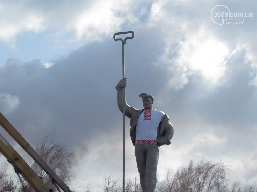На памятник сталевару в Мариуполе патриоты надели вышиванку.