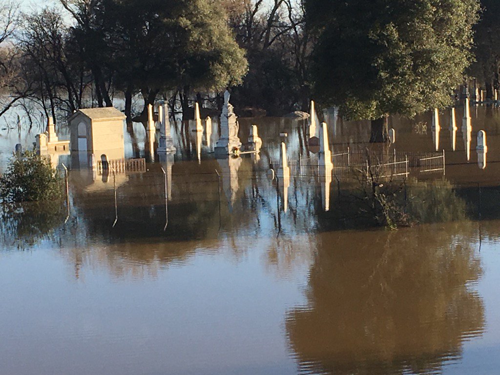 Тем временем, выбирая из двух зол, власти решили махнуть на остатки основного водосброса и врубили его на все 100. Т.е открыли его в режиме 100.000 кубических футов/секунду. Больше было нельзя, во-первых, из-за непонятной скорости разрушения склона, а, во-вторых, такое количество воды с трудом "переваривало" русло реки ниже по течению. По состоянию на сегодняшний день, вода уже затопила кладбище, расположенного относительно неподалеку от Оровилля, городка. Так что некоторым, ускользнувшим от эвакуации человекам, может посчастливиться, в буквальном смысле фразы, увидеть, проплывающим мимо по реке, труп своего врага.