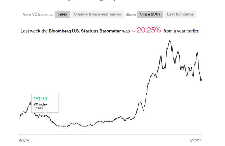 Блумберг завел новый индекс "Барометр стартапов", чтобы отслеживать этот процесс. К сожалению, он не учитывает, сколько стартапов накрылось тазом и закрылось - иначе картина была бы еще более унылой. Но и без этого она интересная: