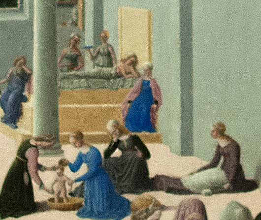 А ниже картина предположительно 17-го века в Church of Sant'Apollinare Nuovo. И на этом полотне мы видим богатое убранство комнаты, где происходят роды.