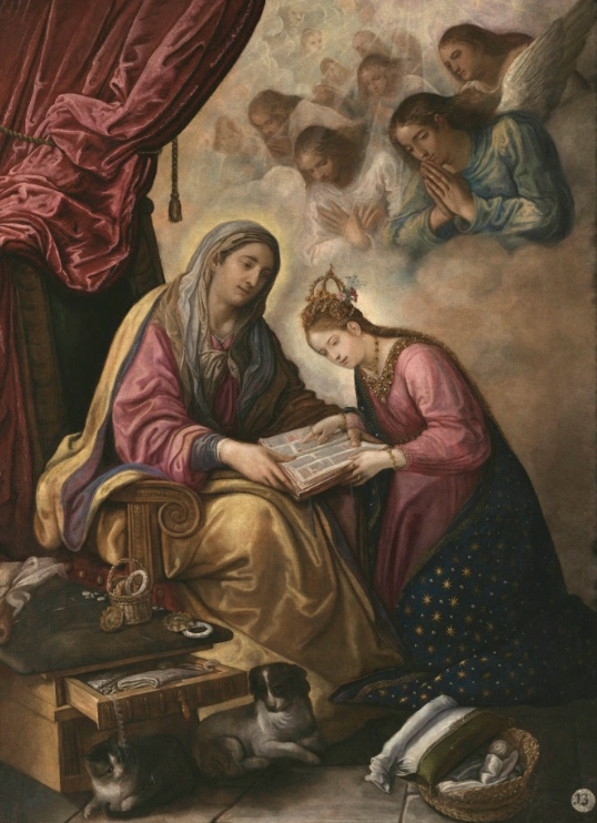 В точности такая же композиция используется и на картине "Saint Anne teaching the Virgin to read" за авторством Juan de Roelas. Также можно увидеть тяжелую бордовую портьеру (символ власти). Кроме того, на голове у девочки изображена корона или нечто, очень похожее на нее.