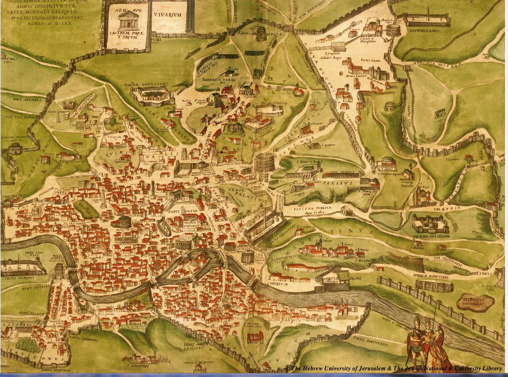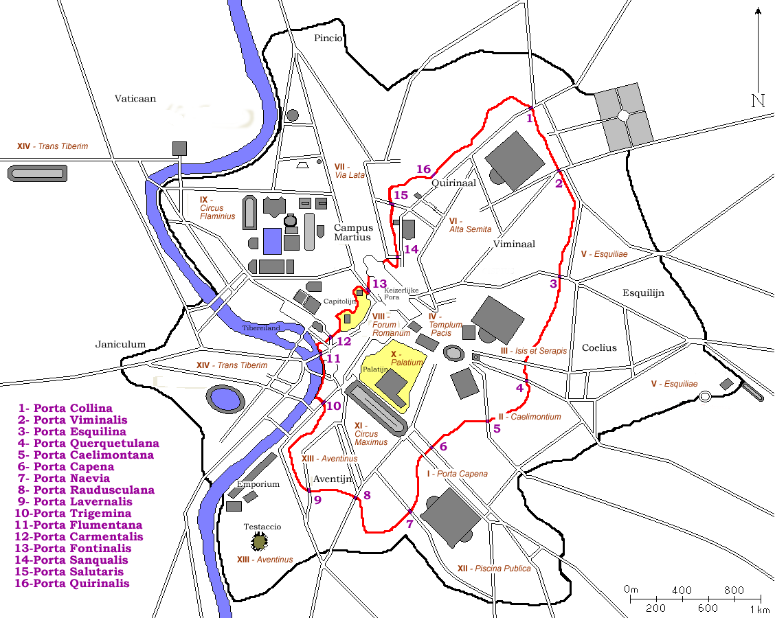Черным обозначена Стена Аврелиана (лат. Mura aureliane) — построена вокруг древнего Рима при императоре Аврелиане в 271—275 годах вокруг более древней Сервиевой стены.