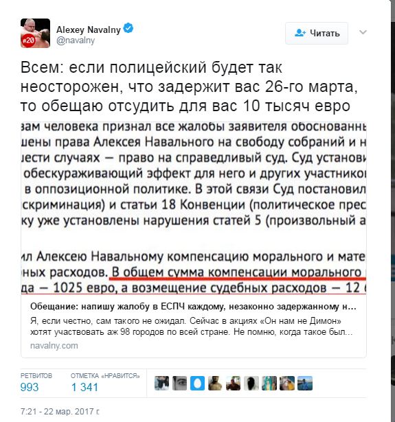 «Кровавые мальчики» на митинге ему в этом могут помочь. Кого не затронет фото или видео с изображением покалеченных или избитых детей? А то, что они будут, не сомневайтесь? Навальный буквально провоцирует людей на беспорядки, дает карт-бланш на беспредел. Если кого схватят, не дергайтесь, Алексей Навальный обещает отсудить в ЕСПЧ 10 тысяч евро. Можно теперь бузить сколько влезет… И это мирное шествие?