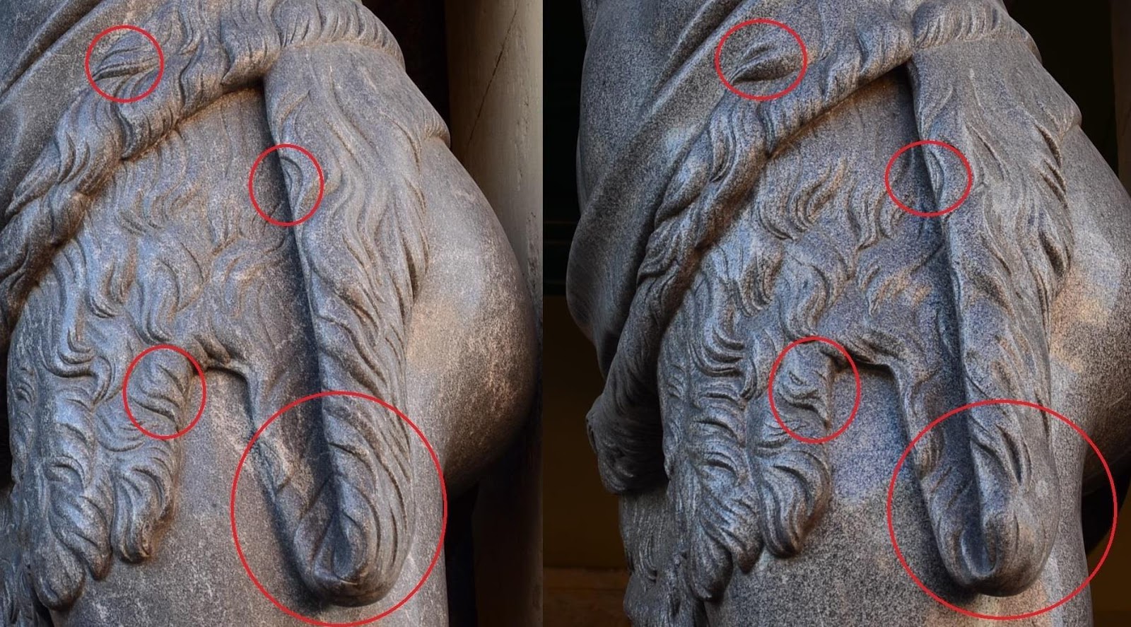 Я думал это знают все, но, попадаются материалы, где исследователи до сих пор думают, что они абсолютно одинаковые, а поэтому делается вывод, что они сделаны по какой-то супер технологии машинного копирования гигантских изделий из гранита или отлиты в одной форме. Но, атланты идентичны лишь на первый взгляд. Но, если приглядеться к деталям, то видны различия.