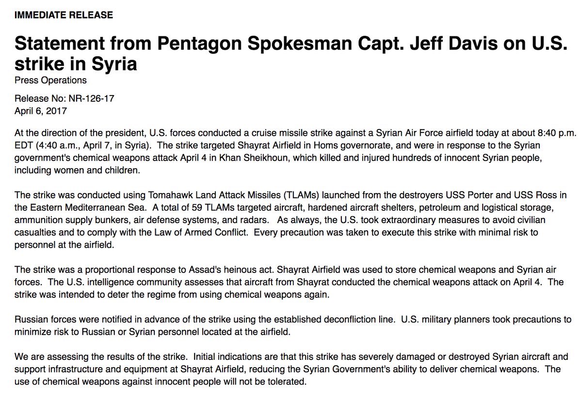 По существу есть что сказать? Информация, выданная на ГА, подтвердилась пресс-релизами Пентагона и МО РФ. Видео последствий ударов также уже доступно - из 59 запущенных, дошли до Шайрата 23 ракеты, из них 16 поразили "где-то ту степь" - от 50 до 100 метров до ближайшего объекта. При этом даже 10 оставшихся ракет было бы достаточно, чтобы стереть аэродром в пыль, Чего явно не наблюдается (проблемы не только с точностью, но и со взрывателями?). Если это не работа нашей РЭБ, то надо признать просто поразительную эффективность "самой мощной и технологически продвинутой армии мира". Впрочем даже наша РЭБ не может служить оправданием такого эпичного результата.. Приходится признать, что нашим калибрам до ихних томагавков ой как далеко.