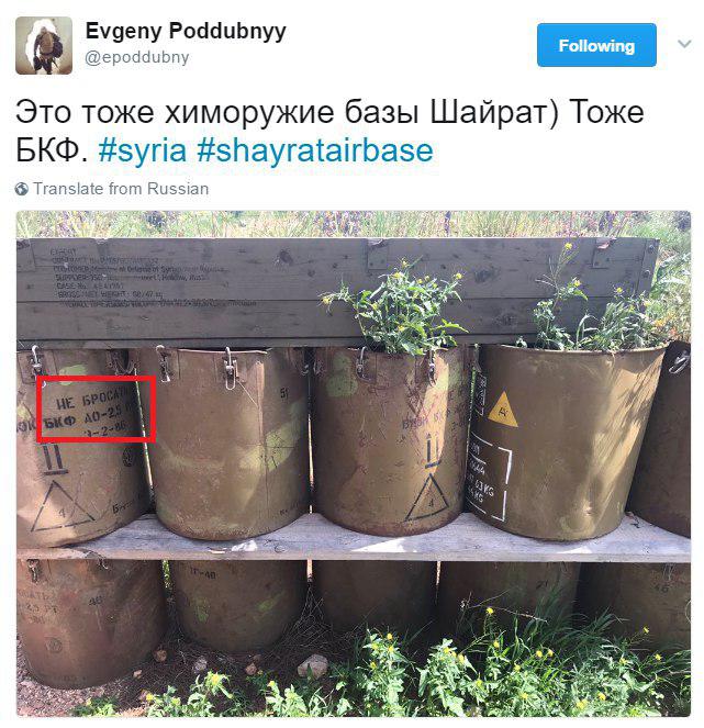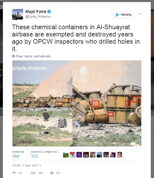 В Твиттере ими были выложены фотографии с изображением контейнеров, с припиской от CIT: «предметы, похожие на советские контейнеры с химоружием». Причем, ни слова о том, что фотографии сделаны на базе Шайрат пару лет назад, во время ликвидации химического оружия в Сирии. Химоружие тогда изъяли, а контейнеры инспектора ОЗХО просверлили.