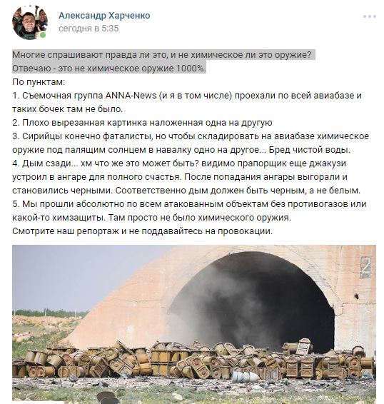 Съемочная группа ANNA-News с Александром Харченко и военным корреспондентом ВГТРК Евгением Поддубным по отдельности посетили военную базу Шайрат, осмотрели окрестности и не нашли даже остаточных следов химического оружия. Фотографии и видео они выложили в Сеть.