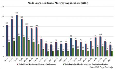 Карнавал унылых новостей о "восстановлении экономики" в США продолжается - Wells Fargo (член "большой четверки" финансовых монстров, лидер по ипотечному кредитованию США) сообщает, что в первом квартале 2017 года, вслед за падением в 4-м квартале 2016, запросы на ипотеку снова сократились на 23%, обновив минимумы с первой волны суперкризиса.