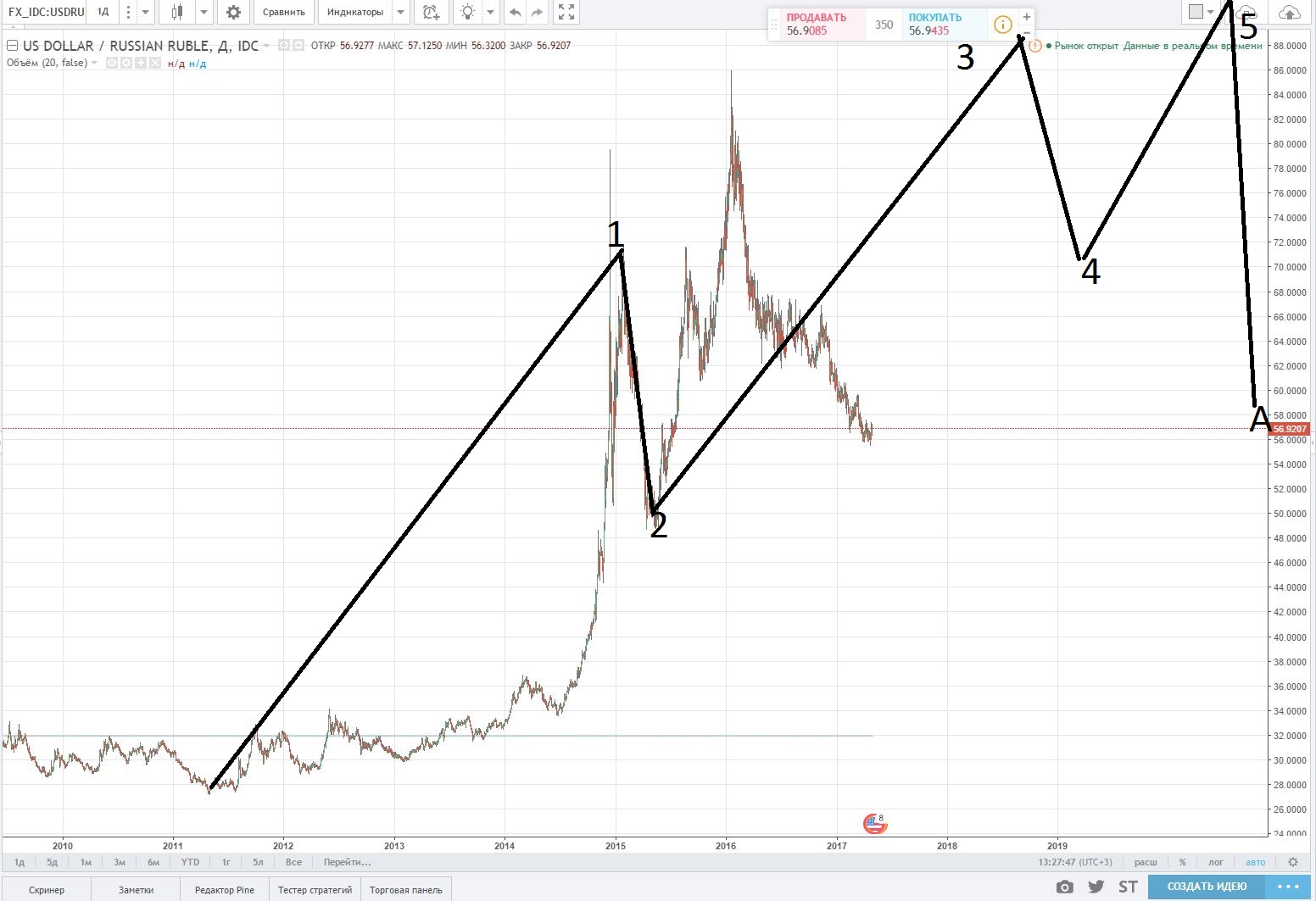 Рассмотрим график курса доллара к рублю с точки зрения волновой теории Эллиотта: