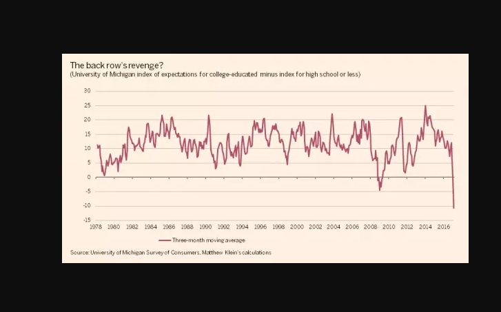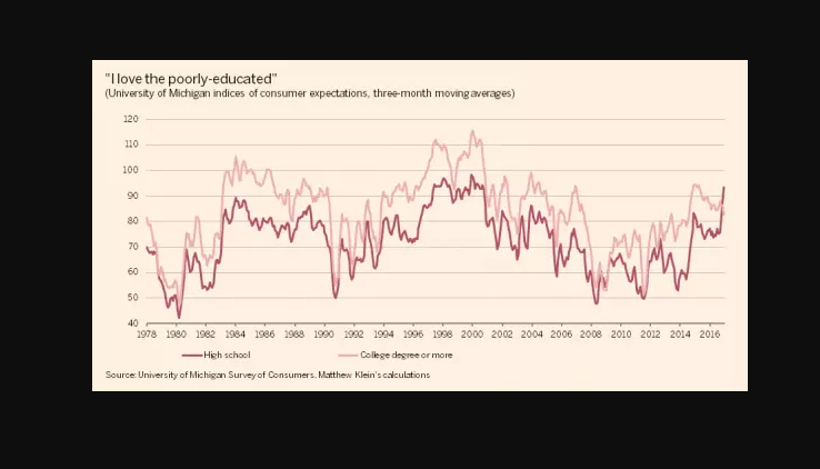 Ладно что бы не мучить тебя, скажу прямо, я думаю разница в ожиданиях, оказалась бы такой же, может только не со стороны образованных было бы падение оптимизма ,а наоборот со стороны менее образованных, победи Хиллари. или просто тоже самое но (с незначительным временным лагом) вот что ... т.е. неважно кто победил бы (скорее всего).