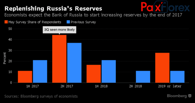 В то время как официальная Москва ломает голову над вопросом, при помощи каких рыночных инструментов можно поставить крест на укреплении рубля, эксперты Bloomberg голосуют за сроки старта программы покупок иностранной валюты Банком России. Доля респондентов, предполагающих, что начало будет положено уже во второй половине 2017, возросла с 37% до 44%. В качестве основных триггеров выступают снижение котировок USD/RUB к области 50-55 на фоне роста цен на нефть, а также риски падения инфляции ниже таргета в 4%.