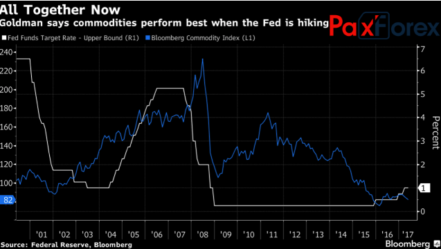 Казалось бы, монетарная экспансия в России на фоне повышения ставки по федеральным фондам в США должна была сделать положение «медведей» по USD/RUB безнадежным. Тем не менее, согласно исследованиям Goldman Sachs, цикл ужесточения денежно-кредитной политики ФРС, как правило, приводит к росту цен на сырьевые товары. И это выглядит логичным, ведь регулятор, по сути спасает экономику от перегрева, а в таких условиях высокий спрос на сырье является нормальным. Таким образом, «бычья» конъюнктура товарного рынка сглаживает фактор дивергенции в монетарной политике.
