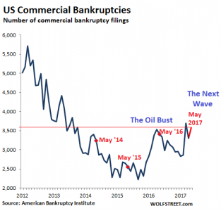 Вопреки обычному сезонному тренду, когда пик банкротств происходит в марте-апреле (что связано с налоговыми циклами), а в мае происходит снижение, American Bankruptcy Institute только что сообщил о росте корпоративных банкротств в мае на 3% относительно апреля, на 4.7% относительно мая 2016 и на 40% относительно мая 2015.