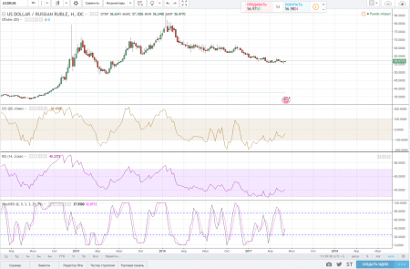 Таким образом, прошый прогноз остаётся в силе - сейчас мы наблюдаем минимумы по USD/RUB, Скоро, вероятнее всего в этом месяце начнётся рост курса доллара к рублю и падение цены на нефть (там то же самое, только наоборот - цена на нефть стабильна, а основные технические индикаторы падают).