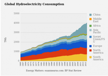 Суммарное потребление энергии, полученной на ГЭС во всём мире кроме Китая, сейчас меньше, чем в 2013 году.
