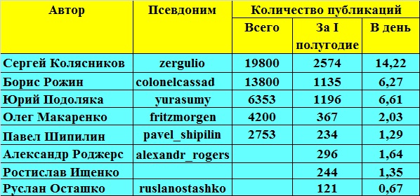 Причем «частописание» Фрица Моргена вовсе не рекорд, другие блогеры публикуют в разы больше. Ниже в таблице я привел количество публикаций наиболее популярных авторов, пишущих в сфере экономики и политики.