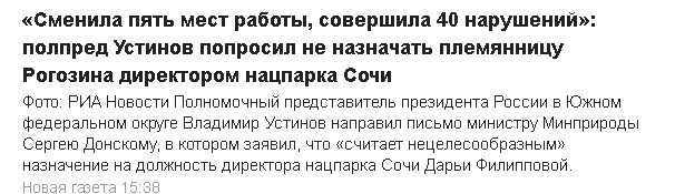 Некоторым камрадам не понравилась история с дочерью Пескова. Интересно, какова будет реакция на назначение Дарьи Филипповой, являющейся племянницей Дмитрия Рогозина, на должность директора нацпарка Сочи? А скоро, наверное, уже и внуки подойдут... ;)