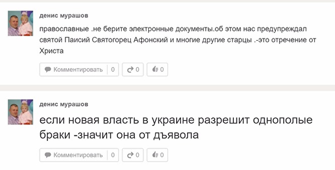 Денис Мурашов действительно показывает свою активную приверженность православной вере, если судить по его странице в соцсети «Одноклассники». Как уже сообщалось, на ней много фотографий Дениса, сделанных рядом с православными храмами и в храмах. Известно, что несколько лет назад Мурашов обвенчался со своей женой. При более пристальном изучении страницы можно найти более резкие высказывания, вполне свойственные фанатично верующим. Например, 5 апреля 2014 года, немногим позже Евромайдана в Киеве, Денис Мурашов написал, что, если новая власть в Украине разрешит однополые браки — значит, она от дьявола. В тот же день Мурашов призвал православных не получать электронные документы.