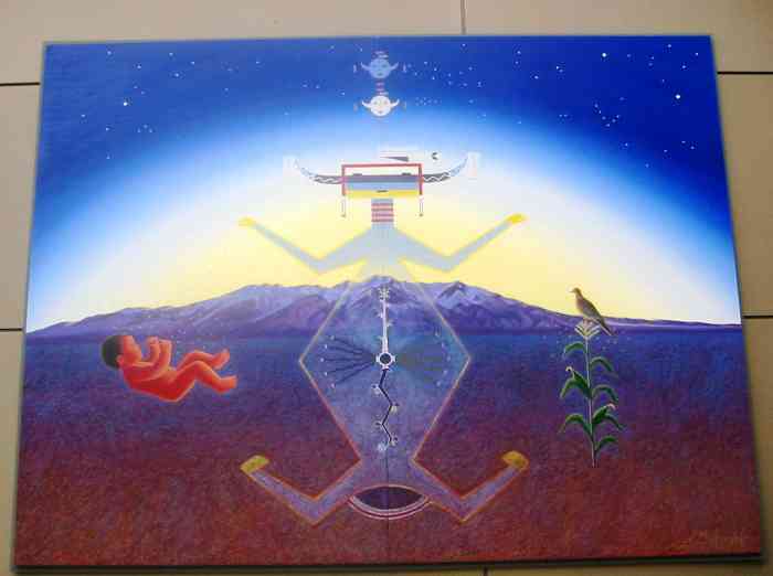 Также на этой фреске изображена индейская девочка, которая держит в руках каменную табличку, напоминающую кусок календаря Майя (некоторые исследователи замечают, что эта табличка напоминает карту России). Что интересно над ней птица Феникс востающая из пламени.