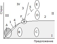 Кстати, о тезисе: спрос определяет предложение. На диаграмме из начала координат проведена тонкая прямая линия 4, отражающая этот тезис. В пределах сектора I эта линия 4 идет в целом согласно с кривой 1, что наводит на мысль о справедливости указанного тезиса при малых значениях спроса и предложения, то есть при рынках небольших размеров. На диаграмме также видно, что при больших объемах рынков (в правой части диаграммы) кривая 1 выполаживается и отклоняется вниз от линии 5, являющейся продолжением линии 4. То есть на больших рынках производство товаров и услуг, предложение их уже не определяется спросом. Что мы и видим на больших глобальных рынках, где наблюдается создание искусственного спроса под напором явно завышенных объемов производства товаров.