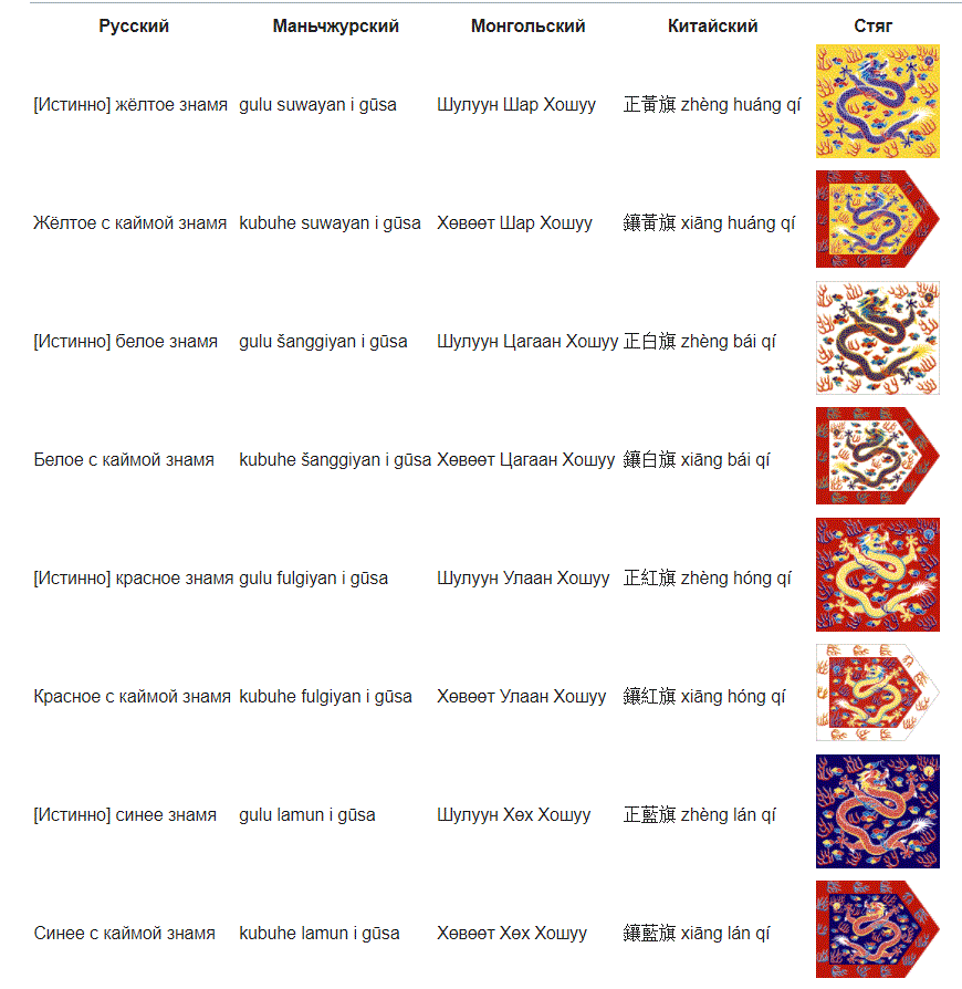 В восьмизнаменной системе маньчжурских войск отсутствуют черные знамена и черная кайма. Зато присутствует синий цвет. И это вопрос для дальнейшего анализа.