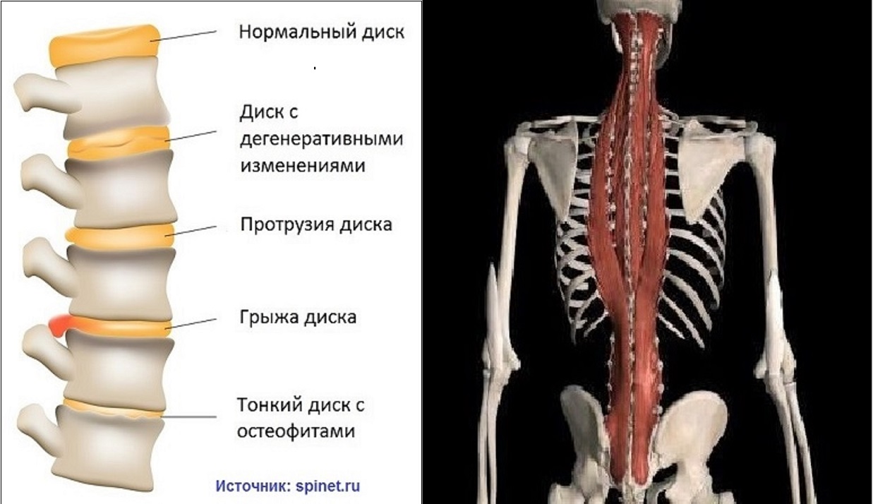 Справа на рисунке 1 изображены две парные мышцы спины, длиннейшая и остистая. Они прикрепляются сухожилиями к позвонкам. Понятно, что, если эти мышцы сильны, человек будет иметь хорошую осанку и гордо держать голову. Усиление мышц путем тренировки будет возвращать межпозвоночные диски в первозданное состояние, это и есть искомый способ лечения. На деле мышц спины намного больше, я показал только две, потому что они нагляднее.
