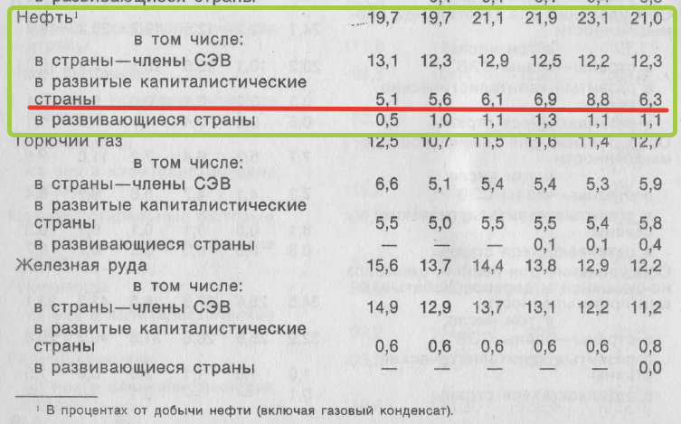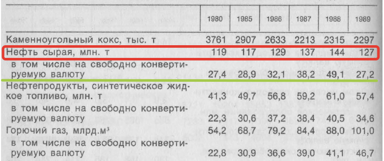 В колонке за 1988 г...по нефти "в том числе на свободно конвертируемую валюту " дана цифра 49,1 млн.т. , именно на этом объёме могло сказаться снижение цен на нефть на мировом рынке, так как в взаиморасчётах стран СЭВ цены не определялись игрой с фьючерсами на биржах. В соседней колонке за 1989 г. присутствует цифра близкая приведенной СГКМ 27,2 млн.т., получается даже немного завышена. Возможно это как то связано с выявленной ошибкой при подготовке материалов.