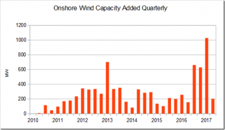В 2016 в Британии был остановлен предыдущий механизм субсидирования зеленой "энергетики" (Renewables Obligation), а в новом (Contract For Differences) не нашлось места для наземных ветряков (onshore). Регуляторы, видать, решили, что высосав столько дотаций в предыдущие годы, отрасль теперь достаточно зрела, чтобы развиваться самостоятельно.