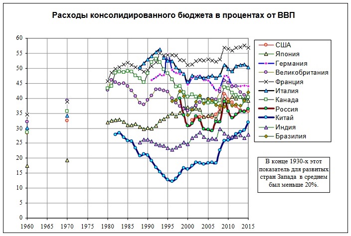 Расходы консолидированных бюджетов 10 крупнейших стран мира изменяются в пределах 27-57 % от их ВВП (рис.1). В России – 37%.