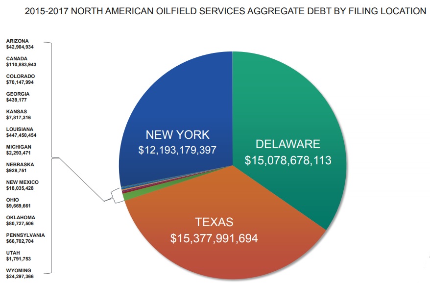 Долговые обязательства, как обеспеченные, так и не обеспеченные активами составили в ~$79,8 млрд. (учтены главы 7, 11, 15 Кодекса о банкротстве). В сравнении с предыдущим отчетом фирмы на конец июля 2017, цифра увеличилась на ~$0,5 млрд. Список компаний расширился со 128 до 134.