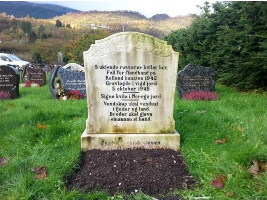 «5 неизвестных русских солдат покоятся здесь. Они пали от рук врагов в Ролланде осенью 1942. Захоронены здесь 5 октября 1945. Спите спокойно в норвежской земле. Зло исчезнет. Братья протянут вам свою руку».