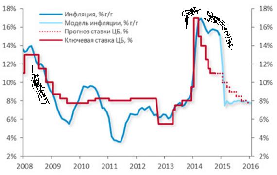 Отлично видно, что сначала падает инфляция, а за ней падает ставка. В остальных местах ставка не меняется, а инфляция падает. Или наоборот инфляция растет- а вслед за ней растет и ставка. Так ничего и не понял?