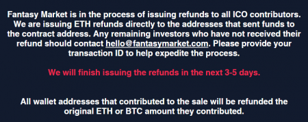 На сайте проекта говорится, что Лукас собирается вернуть средства инвесторам в течение трёх-пяти дней. Один из участников ICO, которому удалось вернуть деньги, обвинил Fantasy Market в мошенничестве: по его словам, он получил сумму в эфирах по сентябрьскому курсу. Он отметил, что с осени стоимость валюты увеличилась почти втрое, таким образом, он понёс значительный ущерб.
