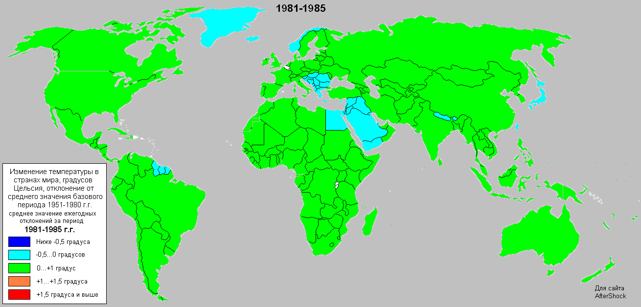 Рисунок 6 – Изменение температуры в странах мира, градусов Цельсия, отклонение от среднего значения базового периода 1951-1980 г.г. (среднее значение ежегодных отклонений за период 1981-1985)
