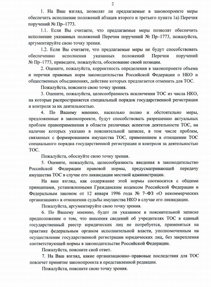 Учитывая поставленные в перечне поручений от 07.09.2017 № Пр-1773 задачи и в целях обеспечения доступа ТОС к поддержке, оказываемой социально ориентированным некоммерческим организациям, не являющимися исполнителями общественно полезных услуг, перечень видов деятельности социально ориентированных некоммерческих организаций предлагается дополнить деятельностью по развитию территориального общественного самоуправления