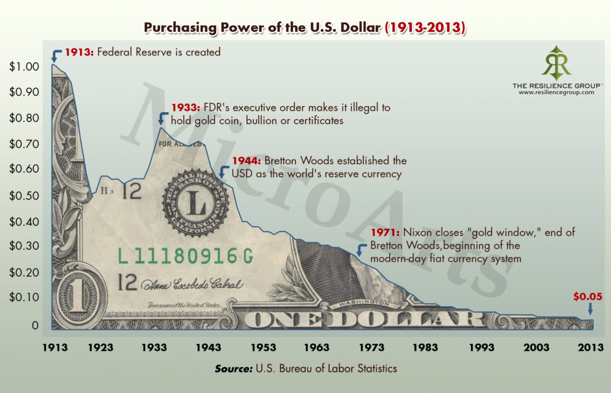 $1 США превращается в 5 центов за 100 лет (см. график ниже).