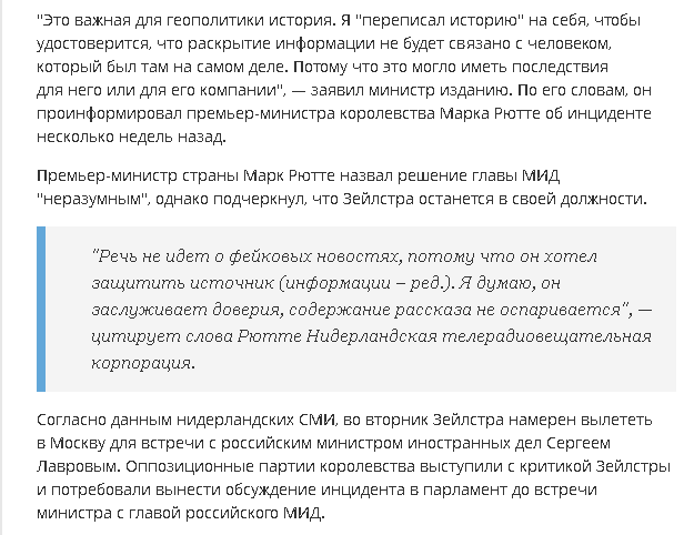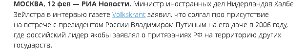 Гляньти на сие, картина мслай : скот врал ГОДЫ . Причом врал он осознанно и не простотама какую то мелочь, он врал о ВСТРЕЧЕ СО СВЕТЛЕЙШИМ КОТОРОЙ НЕ БЫЛО. Он врал о содержании слов Светлейшего, которые Светлейший не произносил . Вдумайтися - этот грязный скот врал как министр Нидерландов, пользуясь всем накаченным авторитетом именно данной должности, так вот, врал он, ни много ни мало о Президенте Российской Федерации , при чом называясь ОЧЕВИДЦЕМ СОБЫТИЯ КОТОРОГО НЕ БЫЛО .