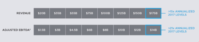 В рамках сценария, в котором Маск достигает максимальных вознаграждений, Тесла должна выполнить 12 из 16 операционных целей. Это может составить 175 миллиардов долларов продаж и 6 миллиардов долларов скорректированной EBITDA, что подразумевает маржу в 3,4% (экстремальный сценарий продаж). С другой стороны, это может быть 75 млрд. Долл. США в продажах и 14 млрд. Долл. США по скорректированной EBITDA, что подразумевает 19-процентную маржу (экстремальный сценарий EBITDA). Это указывает на то, что в соответствии с планом опционов, предоставленным Маск, Тесла может стать очень крупной компанией с очень низкой маржой EBITDA и по-прежнему сохранить премиальные рыночные оценки.