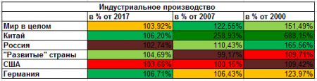 г) индустриальное производство в "развитых" странах выросло по сравнению с тем же месяцем год назад на 4.69%. Средняя годовая динамика за последние 12 месяцев составила 3.12% - для сравнения в докризисную пятилетку 2003-2007 этот показатель составлял 2.52% в год, а в пятилетку "восстановления" 2010-2014 было 2.49% в год, текущие темпы неплохие по историческим меркам. Текущие темпы в общем, очень неплохие по историческим меркам - как и описывали ранее, это достигнуто за счет выжатых досуха экспортеров ресурсов, фактически дотирующих мировую экономику за счет сокращения вложений в свое развитие.
