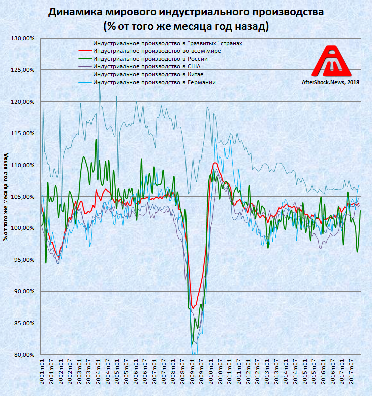 1) динамика мирового индустриального производства (общемировая / по "развитым" странам / отдельно для России / Китая / США / Германии)