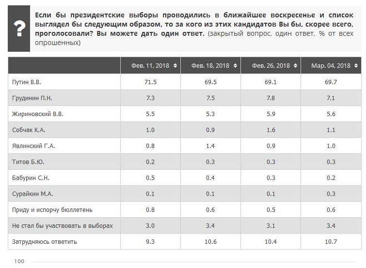 Я ВЦИОМУ НЕ ВЕРЮ!!! Я провел опрос у метро Коломенская. Опросил 119 человек. 44 не будут голосовать точно, 21 - не знают, может будут может нет; 25 - будут, но не сказали за кого; 14 за Путина; 9 за Грудинина; 4 за Жириновского; 2 за Собчак. Делайте выводы сами!