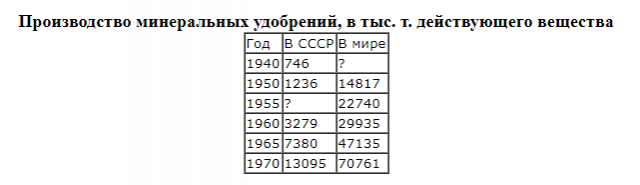 Сразу же выделяется четвертый период, начинающийся в 1949 году, наблюдаемый с этого момента рост урожайности резко выпадает из общего фона, уже к началу 60-х годов урожайность в неурожайные годы превосходит таковую в урожайные годы прошлых периодов. С этого момента продовольственная проблема в СССР перестает быть по настоящему острой. Причины такого развития событий вполне очевидны — это научная организация труда, механизация, развитие агротехники и отдача от систематической селекционной работы. Как иллюстрацию можно привести таблицу производства минеральных удобрений:
