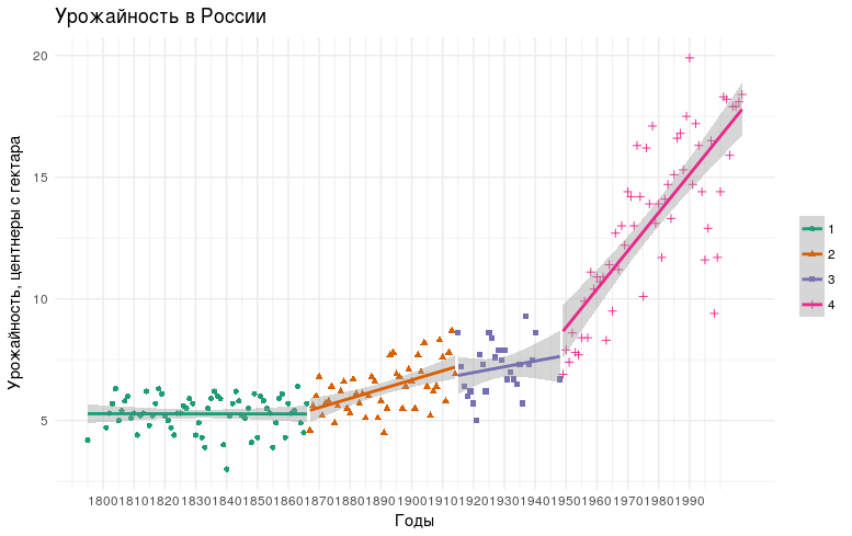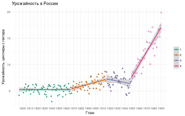 На графике приведены исторические этапы динамики урожайности зерновых в нашей стране. На график урожайности наложены прямые, соответствующие выделяемым авторами периодам. В цифрах это выглядит так: