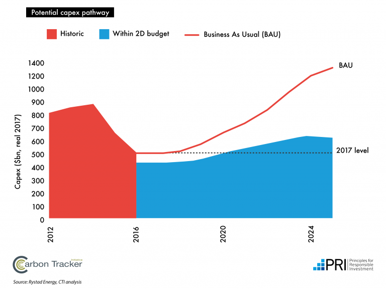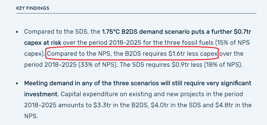 2. При запуске "зеленой политики" в ее агрессивном варианте, направленном на "удержание роста глобальной температуры ниже 1.75°C", множество проектов по добыче углеводородов станут невыгодными и объемы инвестиций коллапсируют на $1.6 триллиона, то есть на треть.