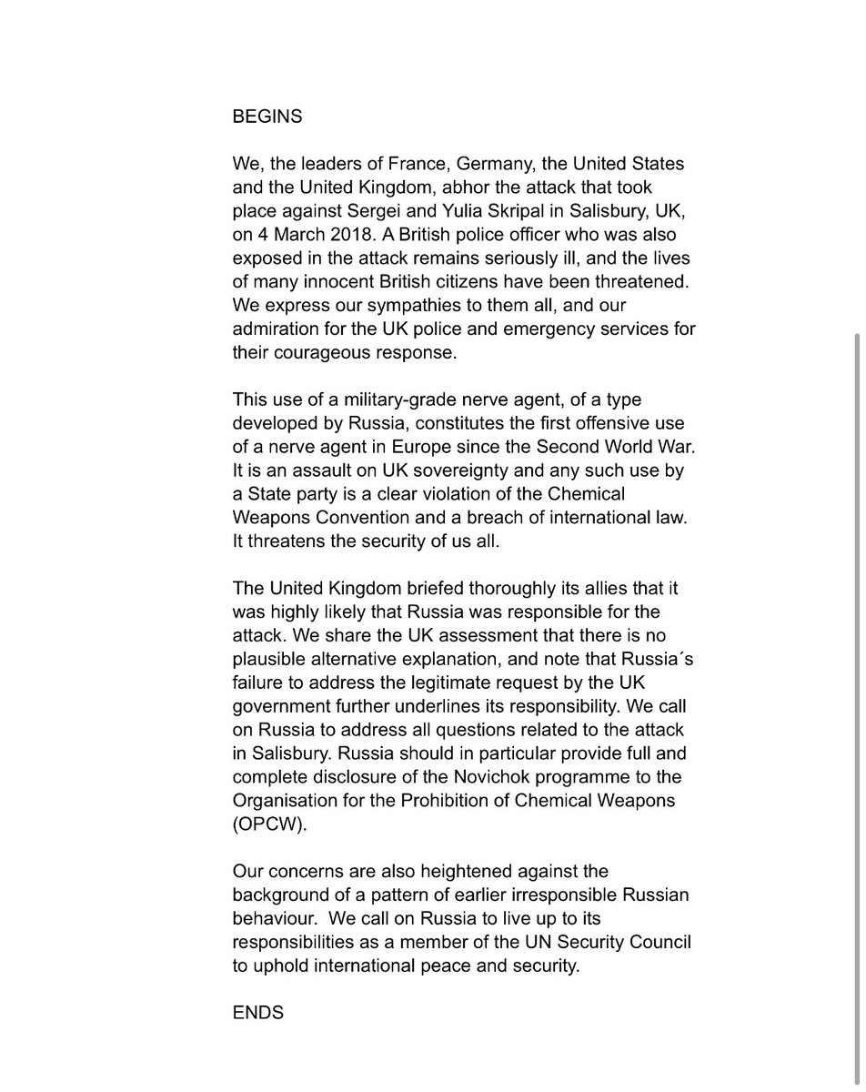 "We, the leaders of France, Germany, the United States and the United Kingdom, abhor the attack that took place against Sergei and Yulia Skripal in Salisbury, UK, on 4 March 2018. A British police officer who was also exposed in the attack remains seriously ill, and the lives of many innocent British citizens have been threatened. We express our sympathies to them all, and our admiration for the UK police and emergency services for their courageous response.