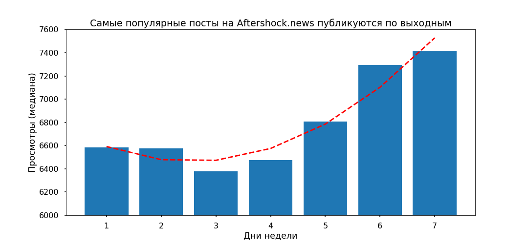 Количество просмотров определяется и днём недели – по выходным посты в среднем набирают больше.