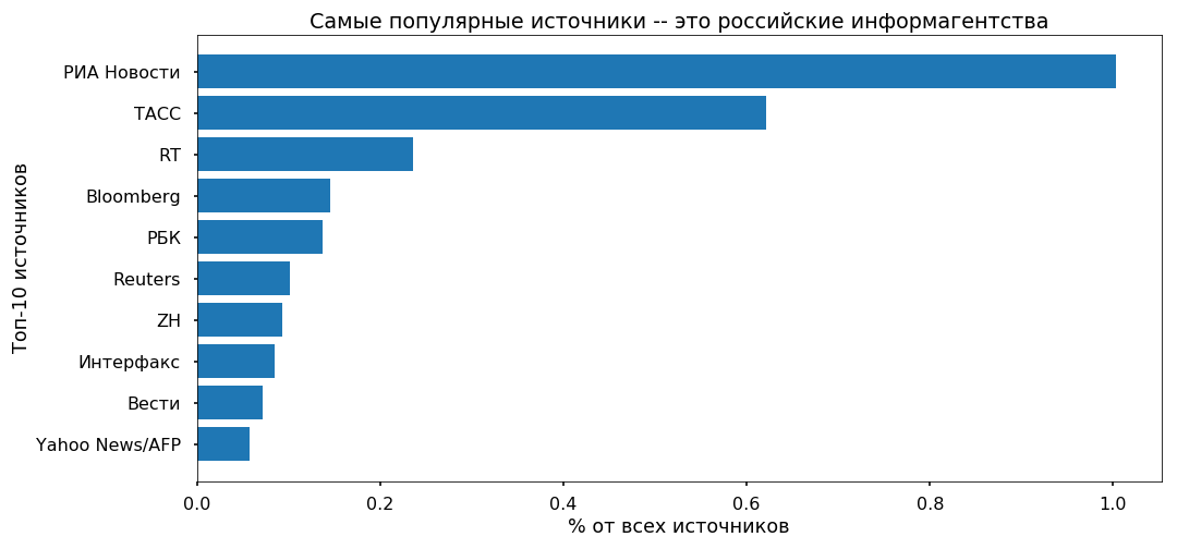 Чаще всего источником для перепостов служат российские информационные агентства, в основном РИА Новости и ТАСС.